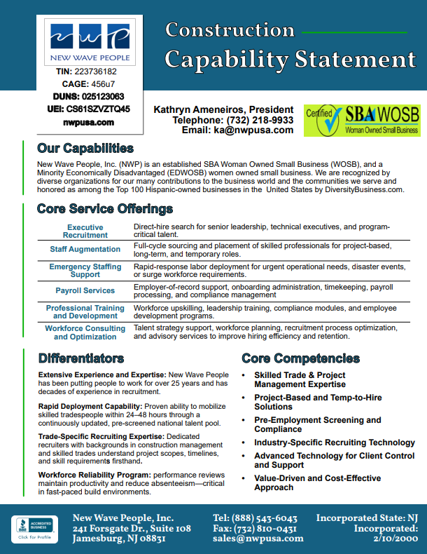 New Wave People, Inc. is a nationally recognized WOSB/EDWOSB staffing firm providing skilled trades, construction management, and professional workforce solutions.