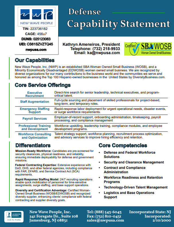 New Wave People, Inc. is a certified WOSB/EDWOSB specializing in defense and federal workforce solutions, delivering rapid-response staffing, security-cleared personnel, logistics support, and technology-driven talent management.
