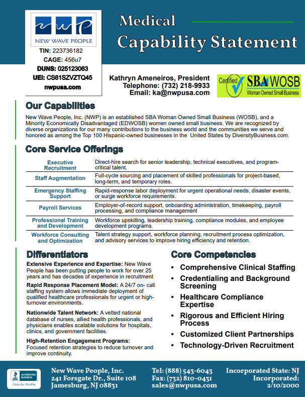 New Wave People, Inc. is an SBA-certified WOSB and EDWOSB delivering nationwide clinical staffing, executive recruitment, and workforce solutions for healthcare and government sectors.