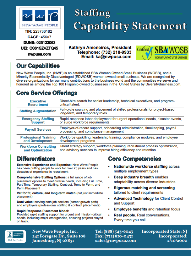 New Wave People, Inc. is a certified WOSB and EDWOSB staffing firm delivering scalable administrative, clerical, and professional workforce solutions across healthcare, finance, education, and government sectors.